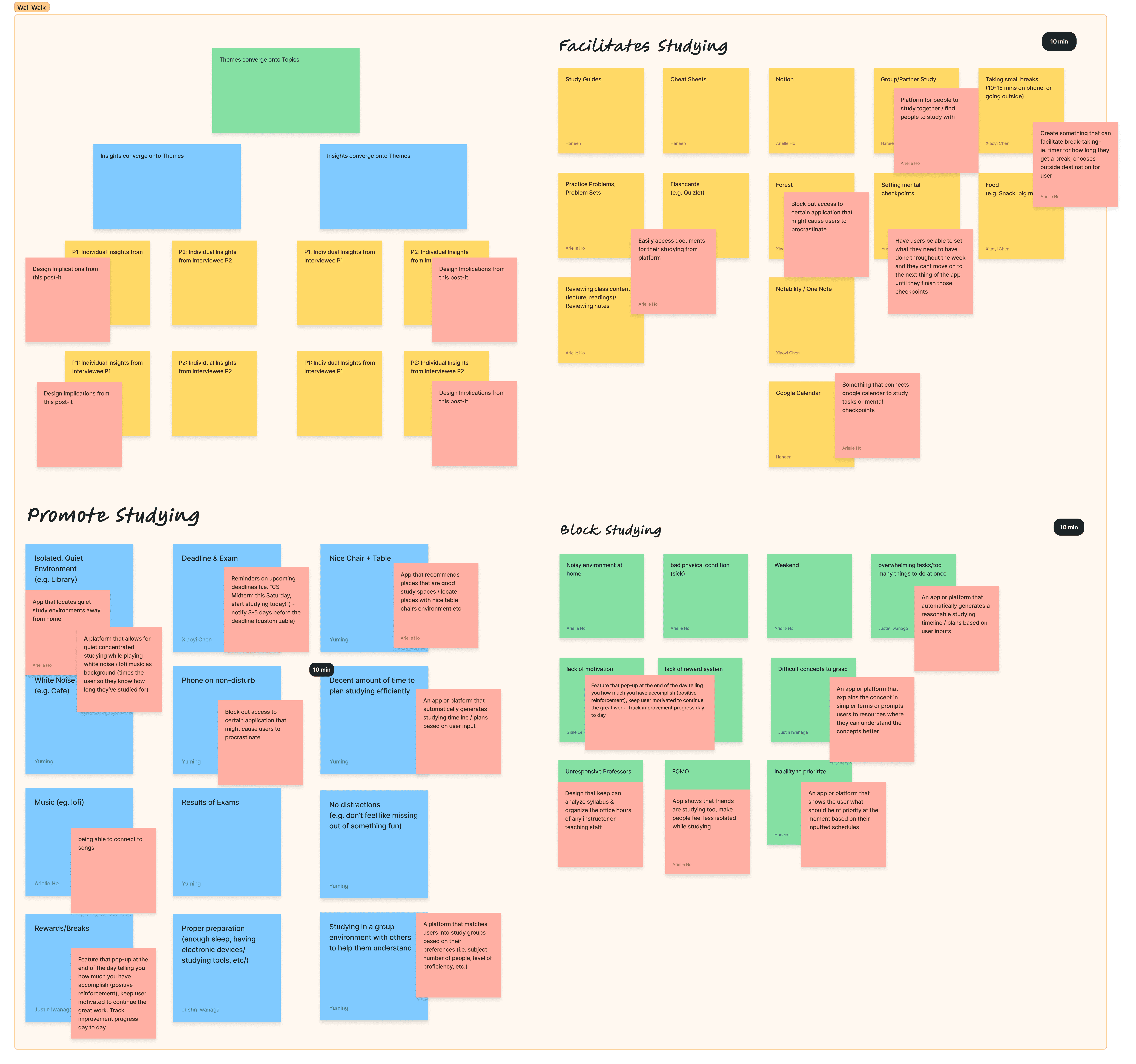 Our design process began with the question: “How might we help college students be more motivated, focused, and mindful of their time while studying?” Our team did a wall walk for our first brainstorming session to encourage rapid ideation, which led us to explore the concept of a virtual study café—a cozy, low-pressure environment that encourages productivity through subtle structure and social presence.
