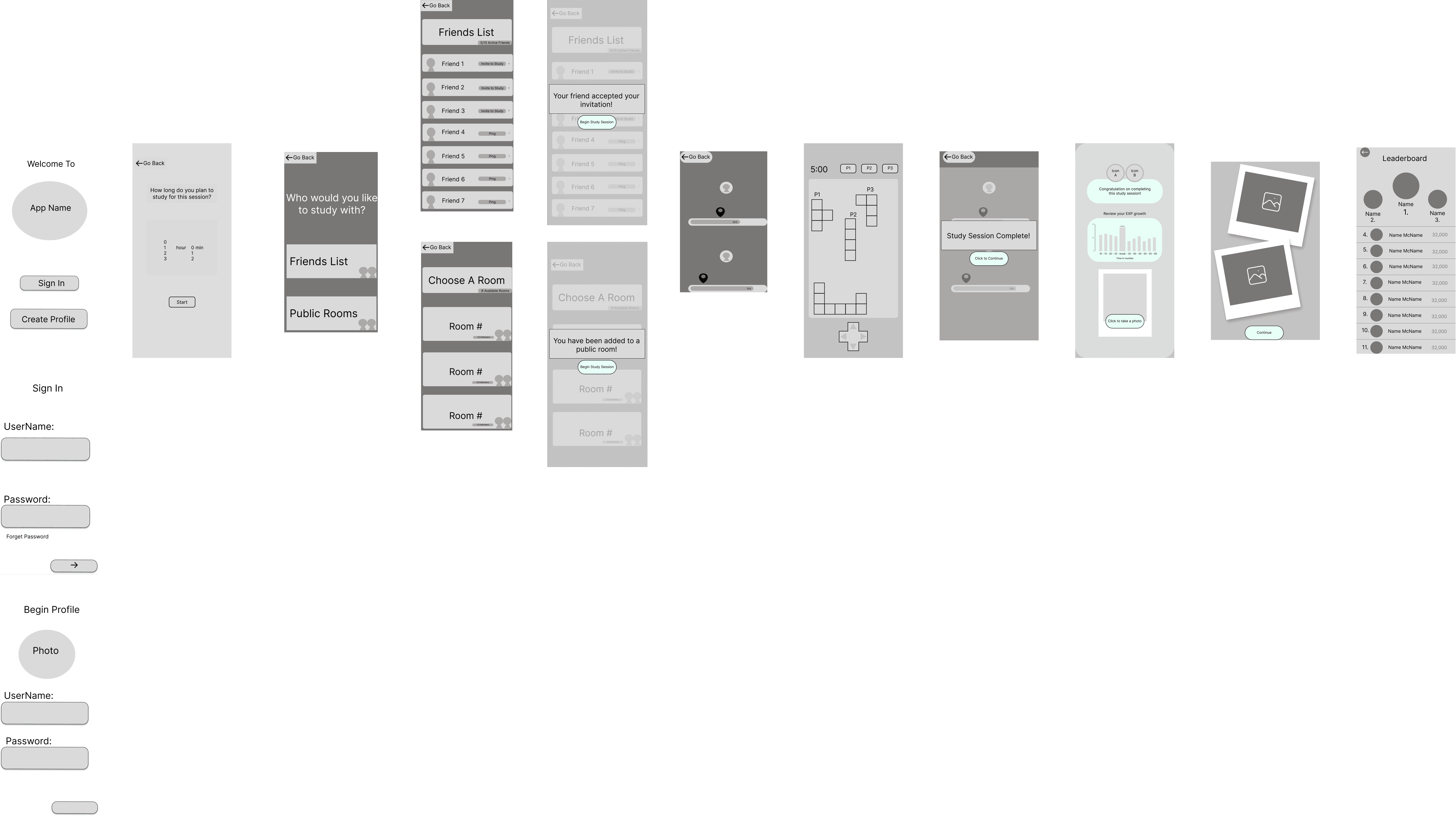 Before diving into visual styling, we created low-fidelity wireframes in Figma to outline the core functionality and flow of Study Café. These early prototypes focused on helping users quickly join a study session, connect with a study buddy, and track their tasks in a lightweight, focused environment. A lot of our designs were inspired by Pokémon Sleep, a popular app that helps people track their sleep better by gamifying the process. We tested several versions of the study timer interface, task list behavior, and matchmaking logic to find the smoothest user journey with minimal distractions. Eventually, these were the frames we believed best represented our vision for this app.