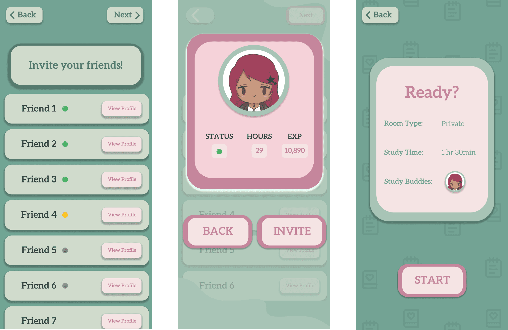 In addition, users are able to invite their friends to join the study session. When viewing the list of friends, the are color icons that indicate if a player is online and available for a study session: green means they are online and available, yellow means they are already in a study session, and gray means offline.